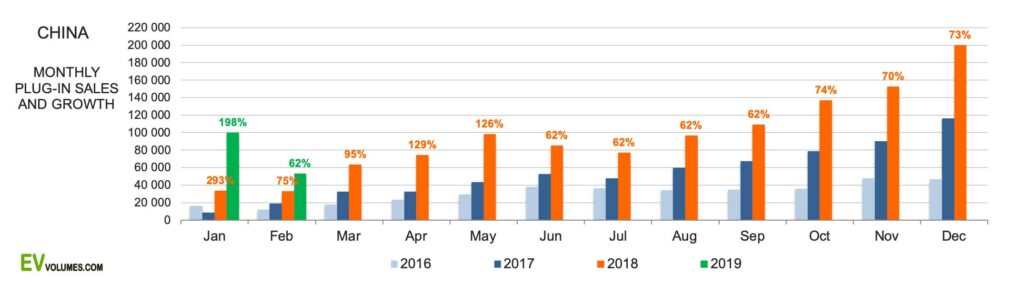 Usually, NEV sales in China start low and finish high, with only ⅓rd of the annual volume in the first 6 months. December 2018 had a staggering 7,6 % NEV share in an otherwise depressed car market. Then, January came in with twice the normal rate and February was atypically lower. We can assume some overstocking at dealers here, ahead of the coming subsidy reductions. The ups and downs are likely to continue in the coming months, which makes 2019 harder to predict than the previous years.