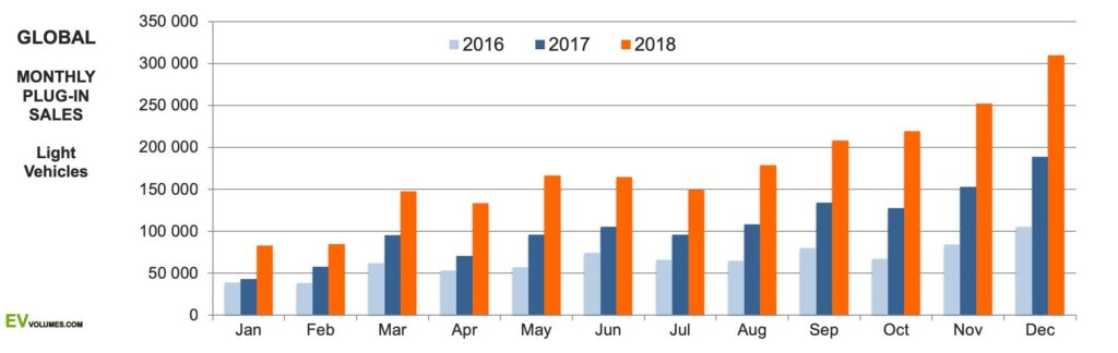 The USA result was all about the Tesla Model-3, which stood for 138k of the 158k increase last year. 80 % of the Model-3 volume was delivered during the 2nd half of 2018. Others include Canada (42 700 sales, +124 %), South Korea (31 700 sales, +134 %) and many fast growing, smaller EV markets around the world.