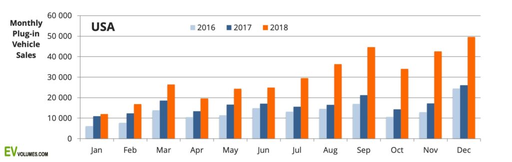 2018 was an exciting year for EV adoption in USA: 360 800 plug-in vehicle were delivered, 81 % more than in 2017 and the highest growth rate since 2013. Pure EVs (BEVs) gained most and represented 66 % of sales; 34 % were Plug-in Hybrids (PHEVs). In 2017 the ratio was 53 % BEV to 47 % PHEV. The plug-in share in the total light vehicle market reached 3 % in November and December and was 2,1 % for the entire year. The preliminary total for the US light vehicle market was 17,3 million, an increase of 0,5 % over 2017.