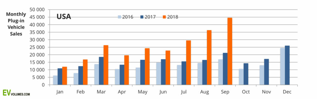 US sales in Q3 were all about the Tesla Model-3: During the first half of the year, it was still plagued by ramp-up problems and contributed with only 2000 to 60oo units per month. In Q3, it started to meet the sky-high expectations with clearly outstanding market performance. 54 300 units were delivered in Q3, to eagerly waiting US customers; weekly production was in the 4000 to 5000 range. With total plug-in category volumes of 110 500 units in Q3, The Model-3 stood for half of this volume and nearly the entire year-on-year increase in the sector. Growth was 107 % for the quarter.